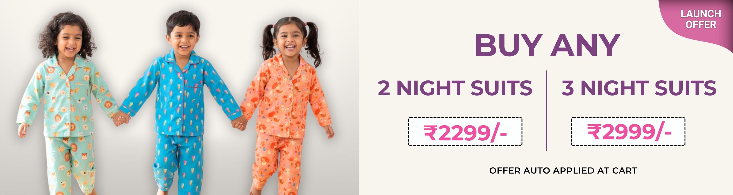 Grab Hold of Comfortable Night Suits Like Never Before! Our nightdress collection features popsicle baby night suits, which are perfect for kids aged 9-10 years. Its soft cotton fabric and all-over print make it look cute and comfortable. The floating dog night suit is also an excellent choice for your snuggle bug. Its soft cotton with a gold finish makes it look lovely. Moreover, our kids’ nightwear comes in multiple sizes, making them a great fit for all. Thus, you can see the size chart before placing your order.