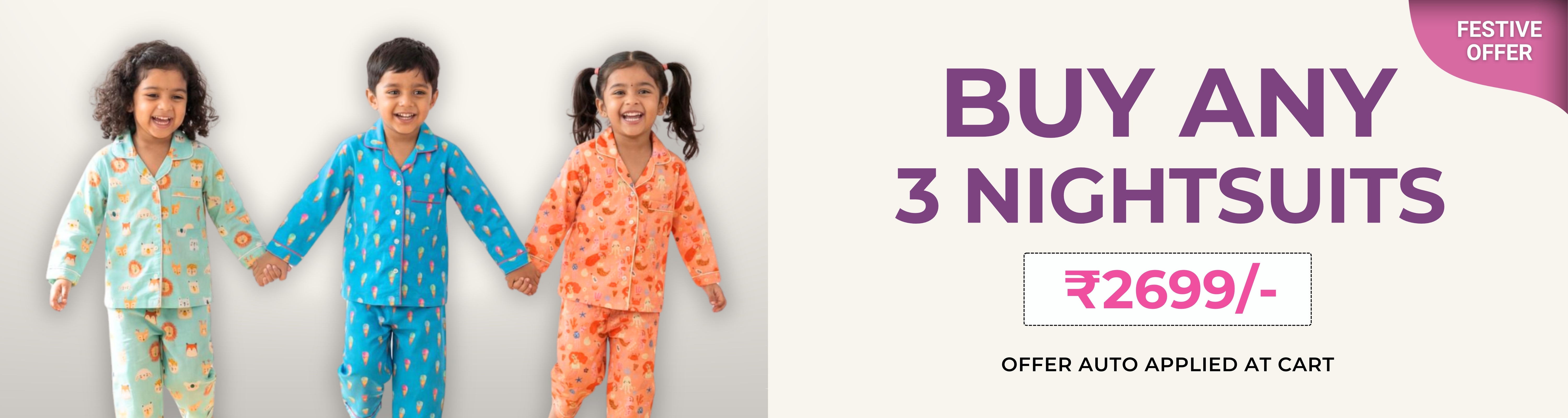 When you buy sleepwear online, the first thing you worry about is whether it will provide comfort for your child while they take a nap or go to bed for the night. Your worries are valid and we understand you, which is why we bring you a wide range of sleepwear for your little ones. You can buy kids’ nightdresses online in India from our collection of cosy and high-quality kids' nightwear. They are made with the best quality fabric, which is soft on the skin. Your little one can comfortably wear them while cuddling to sleep. The whimsical print will make your little fashionista fall in love with their nightwear. The night suit for kids and other baby clothing we have for them are designed to give the utmost comfort.