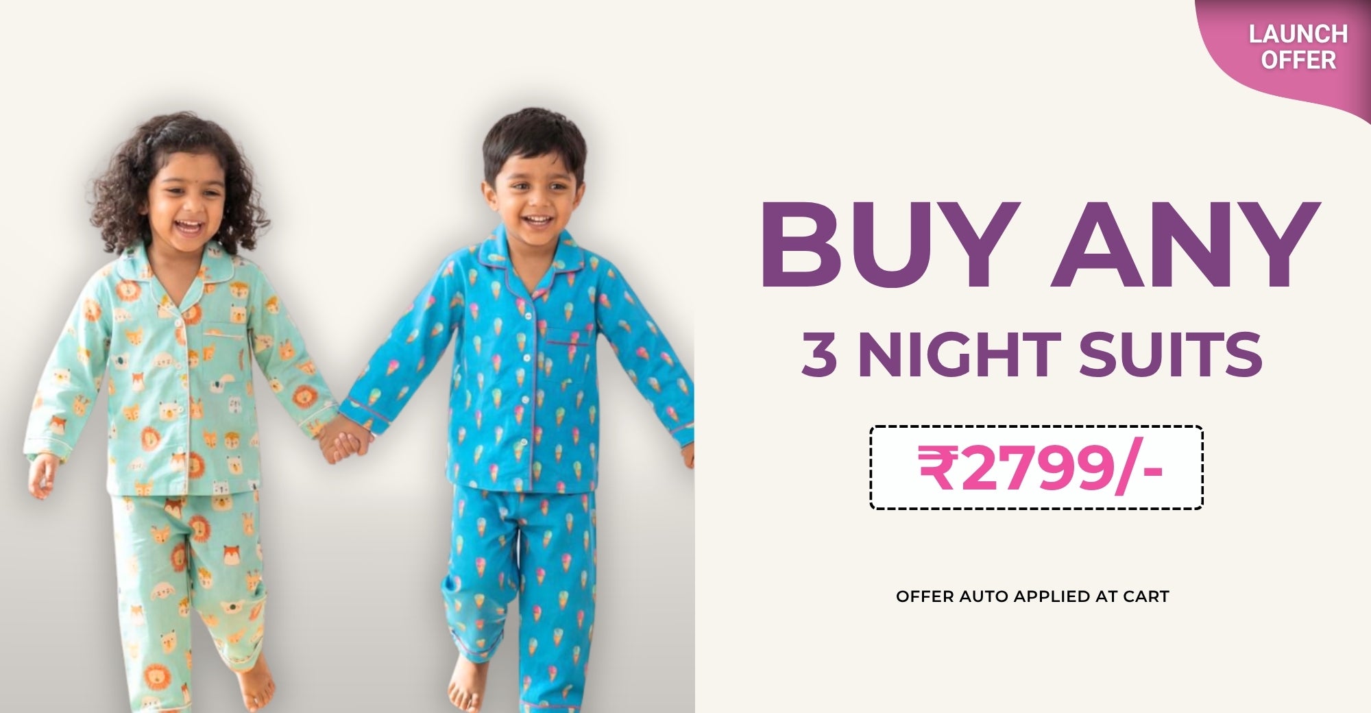 When you buy sleepwear online, the first thing you worry about is whether it will provide comfort for your child while they take a nap or go to bed for the night. Your worries are valid and we understand you, which is why we bring you a wide range of sleepwear for your little ones. You can buy kids’ nightdresses online in India from our collection of cosy and high-quality kids' nightwear. They are made with the best quality fabric, which is soft on the skin. Your little one can comfortably wear them while cuddling to sleep. The whimsical print will make your little fashionista fall in love with their nightwear. The night suit for kids and other baby clothing we have for them are designed to give the utmost comfort.
