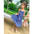 A flared navy blue dress with polka dots and contrasting yellow buttons. It is comfy and airy, perfect for the hot summer weather!