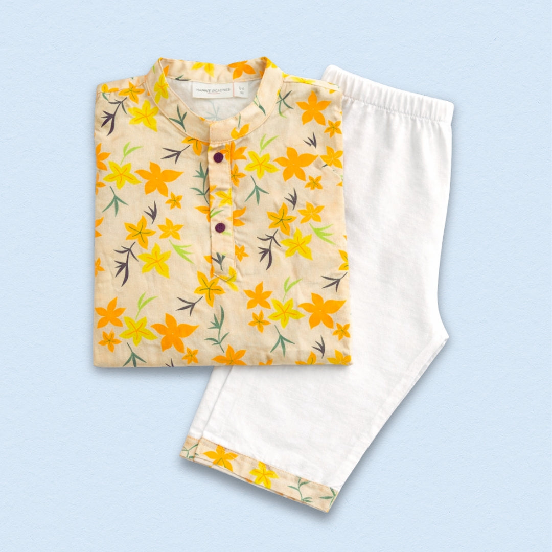 Yes, our Kurta Sets come with white pyjamas that flaunt a matching print at the bottom fold for a complete and stylish look.